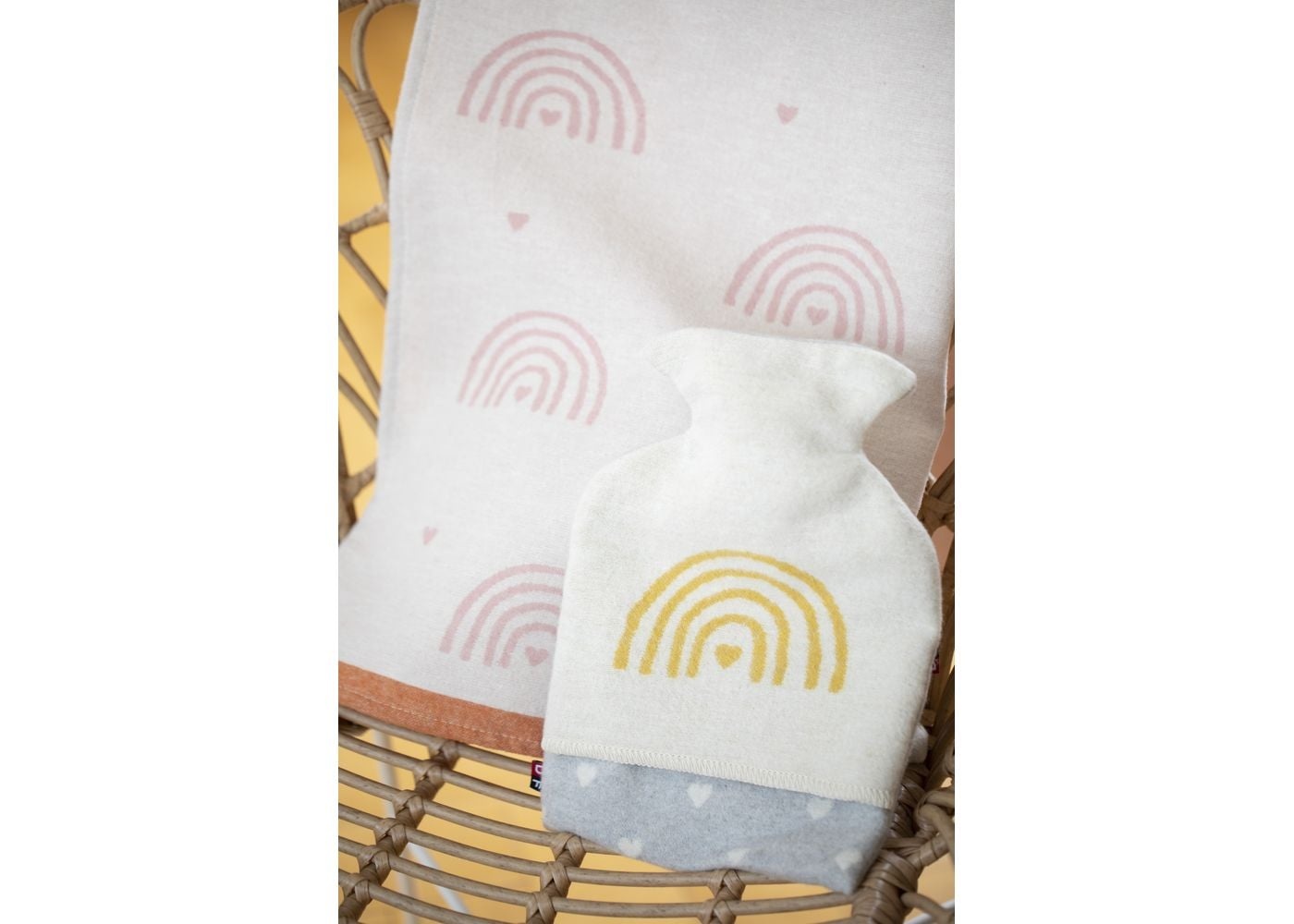 Mit der Wärmeflasche mit flauschigem Flanellbezug wird einem gleich Warm ums Herz und kleine Wehwechen werden effektvoll gelindert. Das fröhliche Design mit dem sonnengelben Regenbogen und der grauen Herzchen-Rückseite wirkt sich bestimmt positiv auf die Stimmung aus. Der Bezug ist abnehmbar mit Hotelverschluss. Der Verschluss der Wärmeflasche ist unter dem Bezug gut geschützt, besonders praktisch bei Kindern. Die Wärmeflasche selbst kommt von Fashy aus Deutschland und ist nach allen relevanten Sicherheitsstandards geprüft, damit du bedenkenlos die wohlige Wärme genießen kannst.. Abmessung: ca. 18x28 cm, Material: 95% Baumwolle, 5 % Viskose, Farbe: pastell, Pflege: waschbar bei 30 Grad im Schonwaschgang, nicht bleichen, nicht trocknen.